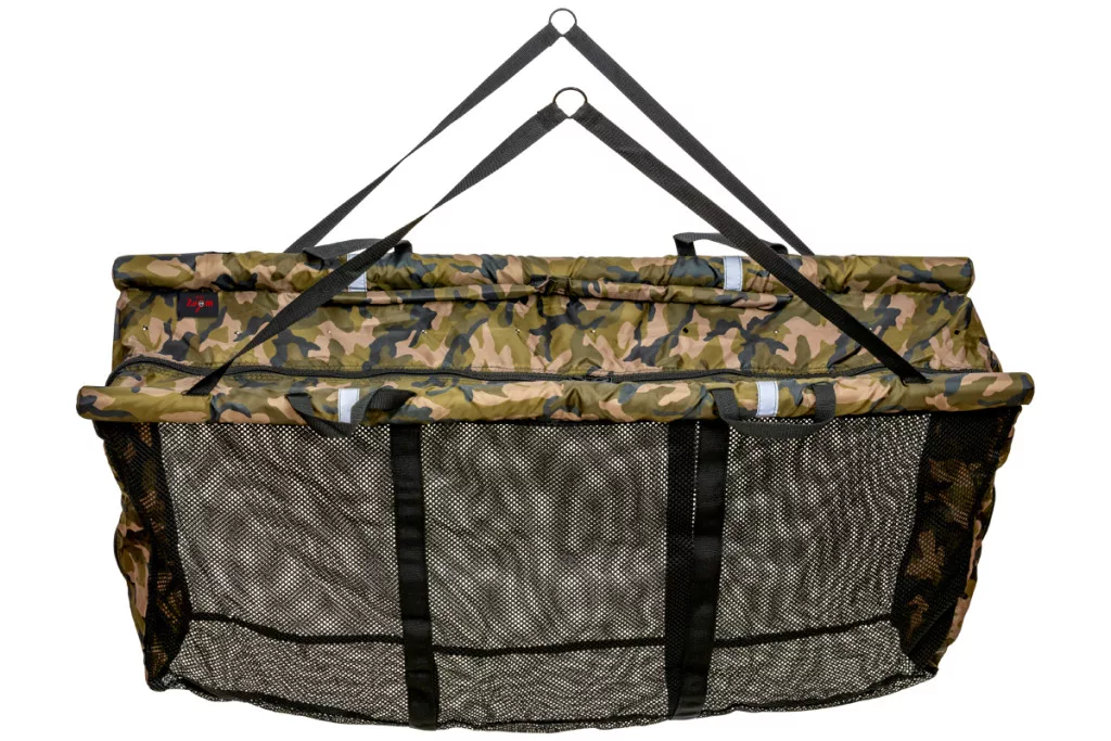 Mérőzsák és haltartó egyben. Méreténél fogva kiváló választás kapitális halak mérlegeléséhez és vízben tartásához, amíg előkészülünk életünk halas portréjához. egy pár mérlegelő és két pár kisebb füllel rendelkezik, felsőrésze szivacsozott, így lebeg a víz felszínen. Strapabíró cipzárral zárható. A hálós rész erős, ugyanakkor halbarát kialakítású. Az oldalán található kis zsebbe a kikötéshez használható kötél található, melynek egyik végére karabiner, a másikra a szabvány leszúrókkal kompatibilis menetes szár került. Extraként fényvisszaverő csíkokkal és a rögzítést segítő gyors kapoccsal látta el a gyártó. A Carp Zoom Camou lebegő haltartó és mérlegelő szák a bojlis horgászok kedvelt darabja.