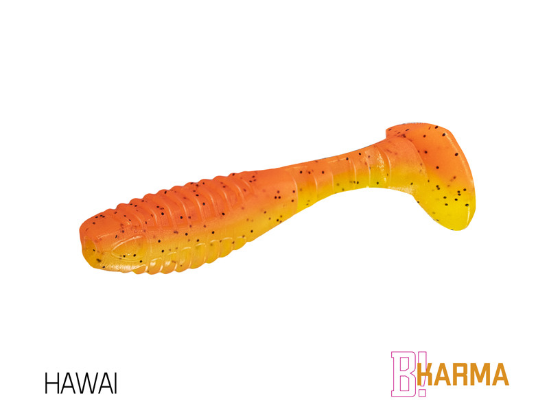 A KARMA modell tervezését kezdettől fogva nem klasszikus megoldásként választottuk a klasszikus modellhez. A cél egy sokrétű felhasználást lehetővé tevő csali megalkotása volt. Első pillantásra észreveheti, hogy a testméret és a csali farok aránya eltér a szokásostól. A csali nagyobb farka a csali atipikus mozgását okozza, ami a farok oszcillációja mellett a test gyengéd forgását is hozzáteszi, ami sérült egyed benyomását kelti. Ez a mozgás rendkívül vonzó a halak számára, és új lehetőségeket kínál a csalival való munka során. A csalitest és a farok csatlakozása között három bevágást modelleznek, amelyek hitelességet adnak a csali mozgásának. A csali teste a háton és a hason rovátkolt. Ennek két oka van. Az első a víz vibrációjának növelése. A második ok az, hogy megkönnyítsük a csali horogra helyezését. A bevágások segítségével pontosan le tudod mérni, hogy a csaliba hova kerül a horog. A jigre való felszúrás így egyszerű. A csali elülső részén a száj területén egy kivágással van módosítva, hogy a csali jobban illeszkedjen a jigfejhez.